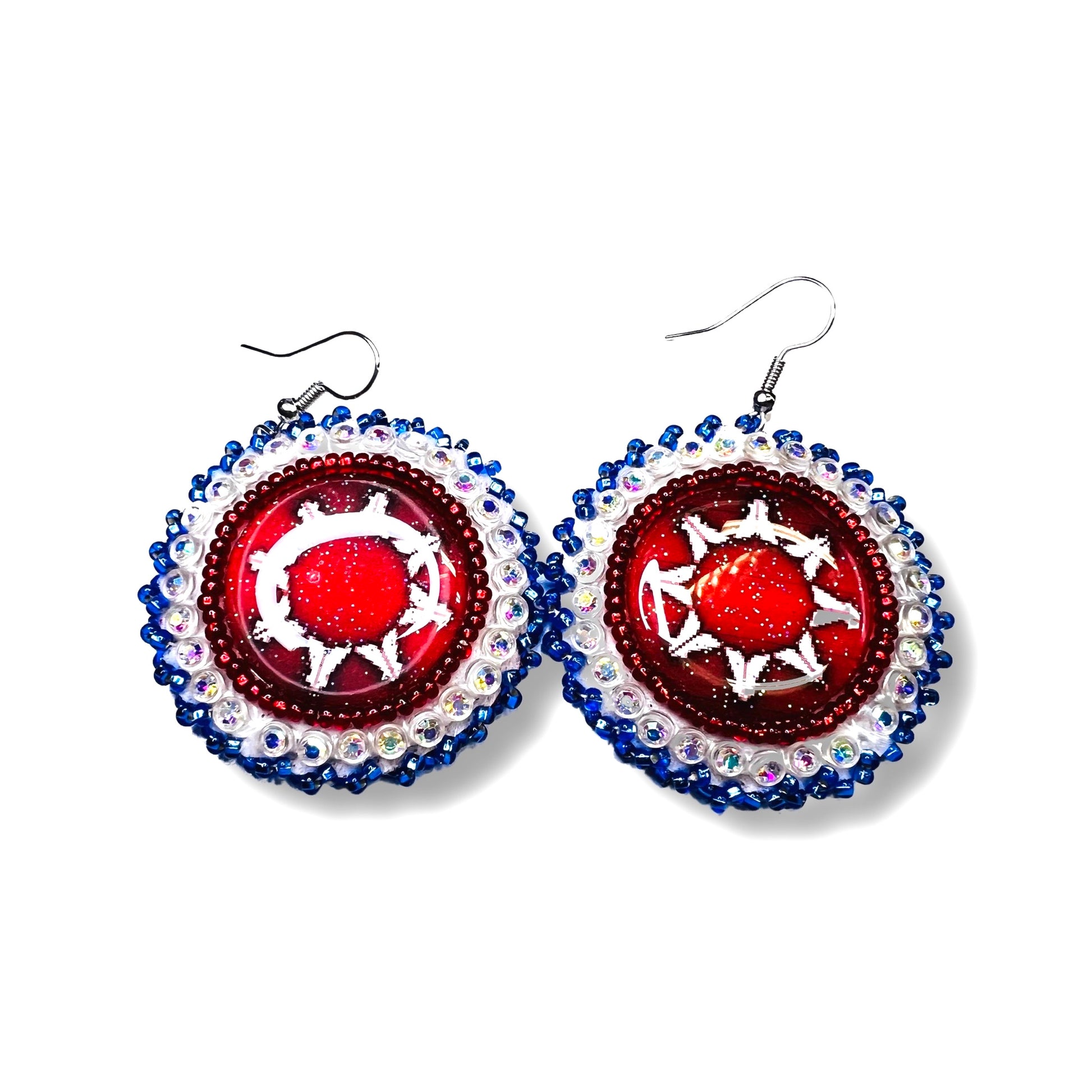 Beaded cab earrings featuring various logos made by local artist Irma Red Ear Horse!
