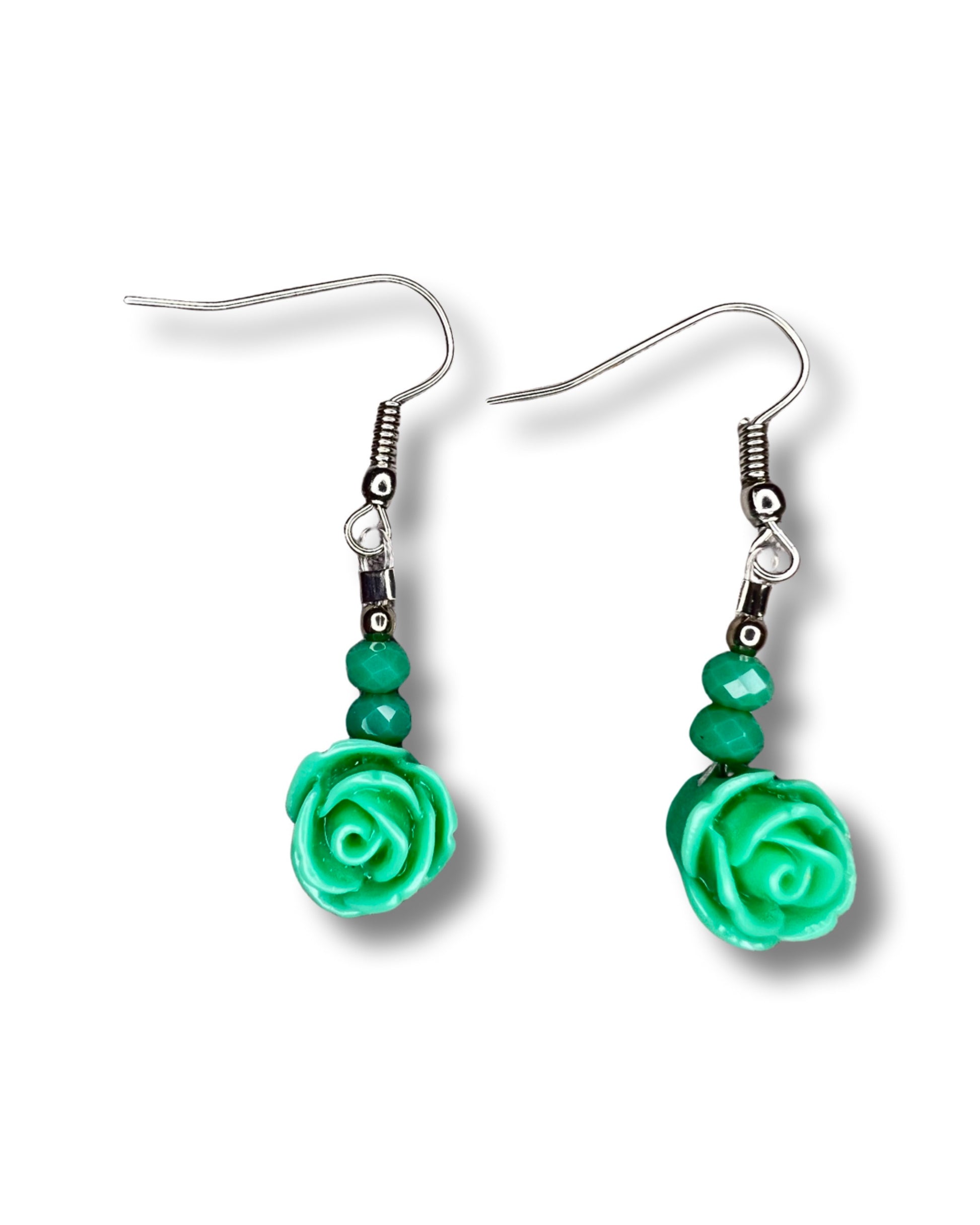 1 1/2" from hook to bottom of earring. Shaped like tiny roses. Made by Irma Red Ear Horse.