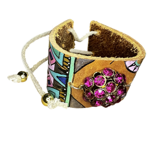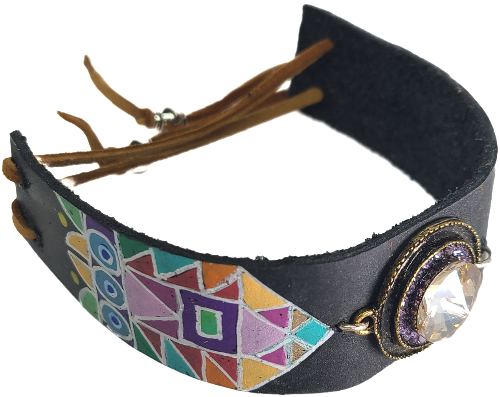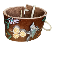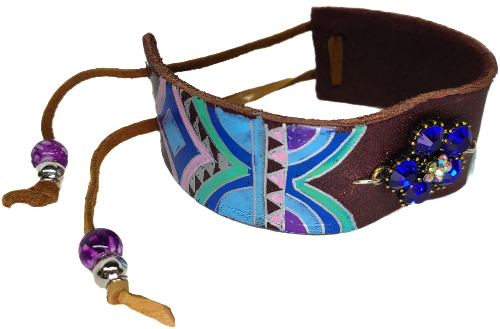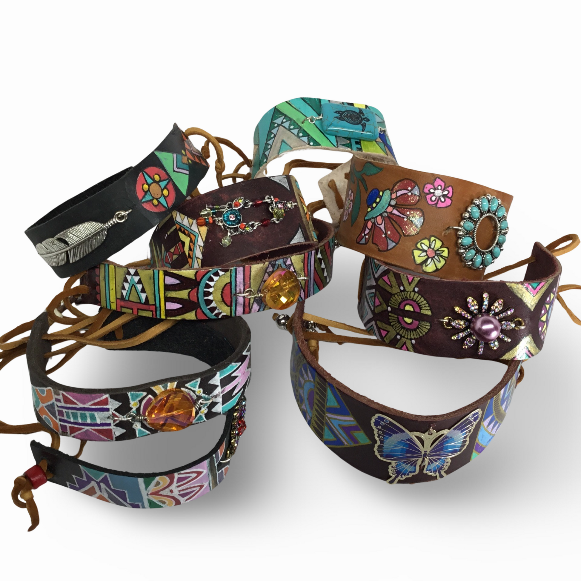 These hand cut leather bracelets, made by local Lakota artist Lorri Ann Two Bulls, make the perfect accessory to any style! Each bracelet comes with a unique, hand painted design & one-of-a-kind centerpiece as well as leather straps to adjust to your liking!